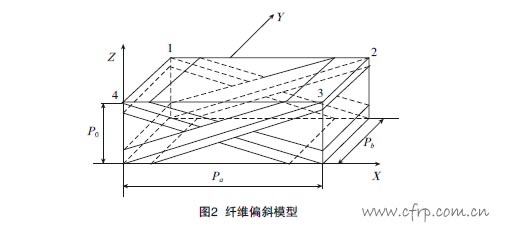由于編織復合材料的基礎是紡織技術,對三維編織復合材料的研究,首先必須搞清楚紡織物結構的幾何模型[4]。美國是研究編織復合材料最早的國家之一。20世紀80年代比較典型的幾何模型當屬美國編織技術的先驅Frank K. Ko和Tsu-Wei Chou及其合作者最先提出的3 種幾何模型:第1種是Ko和Pastore[5]基于三維編織物中的紗線片段提出的一種單元胞體的“取向平均模型”,第2種稱之為“‘米’字枝狀模型”,Ma和Yang等[6]把四步法編織復合材料的單元胞體結構看成是由3根相互正交的紗線和4根對角紗線所組成,針對這些紗線的相互作用建立了細觀分析模型;第3種是Yang和Ma 等[7]的“纖維傾斜模型”。Yang等以由四步法編織的四向編織復合材料為對象,根據(jù)其預成形件內(nèi)纖維束的排列為鋸齒形的特點,建立了纖維偏斜模型。認為在單胞內(nèi)纖維束沿長方體的4個對角線方向排列,在注入基體后形成一個薄的斜板,4個偏斜的單向板形成一個單元,如圖2所示。