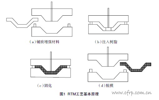 RTM成型工藝是先在模腔內(nèi)預先鋪放增強材料預成形體,芯材和預埋件,然后在壓力或真空作用力下將樹脂注入閉合模腔,浸潤纖維,固化后脫模,再進行二次加工等后處理工序,其基本原理如圖1所示。
