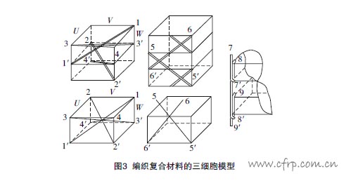 三維編織復合材料的力學模型是以上述細觀結構的幾何模型為基礎的。20世紀80年代至今,代表性的工作有Ma和Yang等的彈性應變能法、Yang和Ma等的纖維傾斜模型、吳德隆和郝兆平的三細胞模型、陳利的偏軸模型和鄭錫濤的正軸模型。90年代后期,梁軍等[16]應用Eshelby 和Mori-Tanaka理論對三維編織復合材料進行了細觀力學分析,然后與剛度平均化方法相結合,對含圓幣型基體微裂紋的三維編織復合材料彈性常數(shù)進行了理論預報。孫慧玉[17]借鑒國外模型發(fā)展了纖維傾斜模型,考慮厚度方向的效應,采用三維應力-應變分析,預報了有效彈性模量,并將此空間多向層合板力學模型引入到了強度性能的預報。王波等[18]提出了剛度合成法預報編織復合材料剪切彈性模量,比較了整體編織試件和裁剪所得試件的理論剪切性能,分析了剪切性能隨試件沿寬度和厚度兩個方向內(nèi)部單胞數(shù)目的變化規(guī)律。目前也有關于編織復合材料彈性性能、損傷、強度以及在超常環(huán)境下性能的工作報道。陳利和陶肖明等[19]基于變分原理,提出用有限多相單元法來預測三維編織復合材料的彈性性能。劉振國和盧子興等提出了一種預報編織復合材料剪切性能的“米”字型體胞的有限元計算模型[20]。黃爭鳴[21] 建立了“橋接模型”并分析了編織復合材料的剛度和強度性能。徐焜和許希武[22]基于八邊形纖維束截面單胞模型,采用細觀非線性有限元方法,建立了三維四向編織復合材料的漸進損傷拉伸強度模型。曾濤等[23-24]利用四纖維體胞模型,提出了一種多相有限元數(shù)值法,基于Tsui-Wu失效準則和Mises準則預報了三維編織復合材料的非線性響應和損傷演化。Alzina[25]等用多尺度分析方法預報了低溫下編織復合材料的熱彈性性能。 123,123