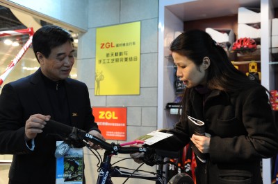 中復(fù)神鷹碳纖維有限公司董事長張國良(左)為本報記者介紹用我國自主生產(chǎn)的碳纖維制造的自行車。