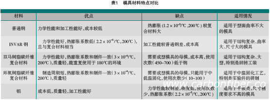 用作復(fù)合材料成型模具的材料主要有普通鋼、INVAR鋼、復(fù)合材料(雙馬和環(huán)氧樹(shù)脂)、鋁等。通常根據(jù)材料的性能(主要是高溫下的熱膨脹系數(shù))、成本、周期及使用次數(shù)來(lái)選擇,見(jiàn)表1。 123,123