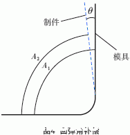 除模具的膨脹對(duì)制件固化變形有影響外,復(fù)合材料制件因?yàn)殇亴雍徒Y(jié)構(gòu)的不對(duì)稱性,以及材料本身的固化特性,在固化時(shí)產(chǎn)生內(nèi)應(yīng)力也將引起制件變形。而對(duì)于梁、長(zhǎng)桁類有大夾角的零件,固化變形最顯著的是回彈角,即制件在固化脫模后,夾角因收縮而小于模具角度,此差值為回彈角。如圖4所示,A1為模具夾角,A2為制件脫模后的夾角,θ為二者之差,即回彈角。在設(shè)計(jì)時(shí),不考慮回彈角或考慮不當(dāng),將對(duì)制件質(zhì)量產(chǎn)生較大影響,特別是對(duì)裝配的影響。