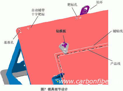 (4) 靶標(biāo)孔:用于手動(dòng)鋪貼時(shí)放置激光投影的靶標(biāo),以定位鋪層區(qū)域。靶標(biāo)孔按實(shí)測(cè)值即可,坐標(biāo)值刻于模具上。