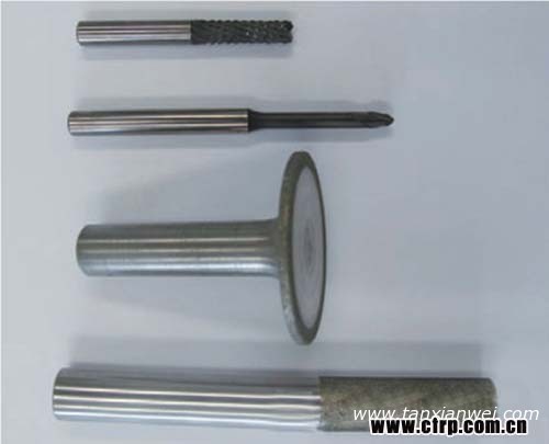 上面的兩個(gè)是通過(guò)CVD(化學(xué)氣相沉淀)涂布了金剛石的超硬合金立銑刀,屬于市售工具。下面兩個(gè)是電沉積了金剛石砂粒的工具,是在工具廠商協(xié)助下自制的工具。