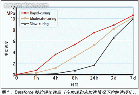 圖2為不同反應(yīng)狀態(tài)的膠的硬化曲線對(duì)比。約40分鐘后,快固膠達(dá)到了必須的0.3MPa的操作強(qiáng)度。