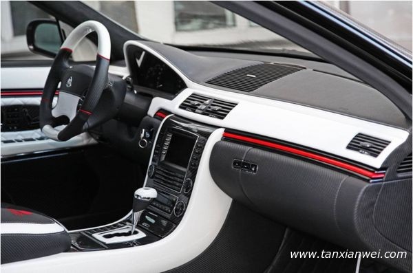對(duì)于車(chē)身的改裝添加的部件全部采用了碳纖維材料,包括:前后擋板,新的發(fā)動(dòng)機(jī)罩 ,行李箱蓋,車(chē)尾擴(kuò)散器和后擾流板,另外還未它配備了LED日間行車(chē)燈以及24寸輪轂。輪轂的表面經(jīng)過(guò)碳處理,并配以白色剎車(chē)卡鉗形成了強(qiáng)烈的對(duì)比。