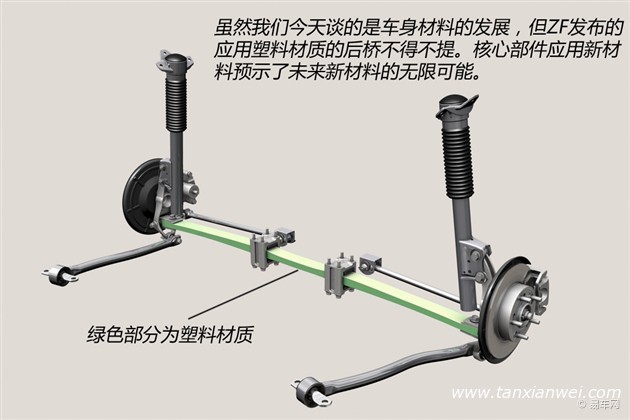 除了傳統(tǒng)的汽車外飾件,塑料材質(zhì)應(yīng)用的極致案例要數(shù)ZF推出的纖維強(qiáng)化塑料的后橋系統(tǒng)了。核心部件應(yīng)用塑料材質(zhì),代表著塑料在未來汽車領(lǐng)域的無限可能。