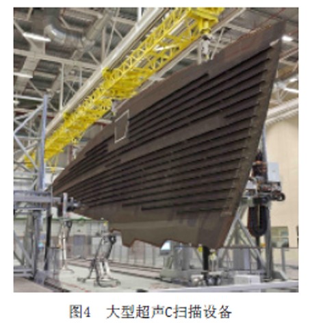 隨著復合材料在航空結構件上應用比例的不斷提高,為保障飛行安全,監(jiān)控復合材料結構內(nèi)部質(zhì)量受到越來越廣泛的關注。目前,航空復合材料無損檢測方法主要有超聲檢測、射線檢測等。大飛機復合材料檢測涉及到大面積的快速檢測和復雜結構的檢測,因此需要配置大型C掃描設備(圖4)和X光無損檢測設備。