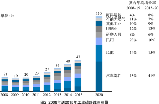 2010年,包括體育休閑和宇航在內(nèi)的工業(yè)應(yīng)用大約消耗了總產(chǎn)量31000t中的20000t,已占到碳纖維消費量的2/3(見圖1)。到2015年,體育休閑消費量將超過7000t/年,同時工業(yè)消費量應(yīng)從20000t/年增長到47000t/年,到2020年,甚至達(dá)到110000t/年(見圖2)。從中期看,風(fēng)電葉片可能是碳纖維需求的主要動力,而從長期看,汽車行業(yè)將促進(jìn)碳纖維的需求。僅靠汽車行業(yè)就能改變碳纖維復(fù)合材料生產(chǎn)企業(yè)的面貌。 本文來自123