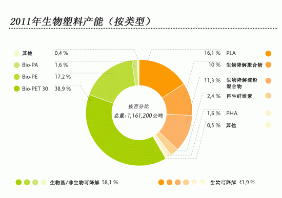 圖2:2011年不同類型的生物塑料的產(chǎn)能(數(shù)據(jù)來源:歐洲生物塑料協(xié)會、漢諾威大學(xué)應(yīng)用科學(xué)和藝術(shù)學(xué)院、IfBB—生物塑料和生物復(fù)合材料學(xué)會)