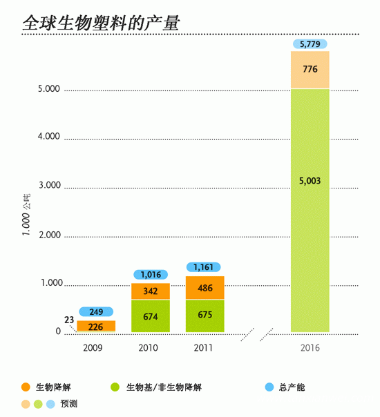 基于可再生原材料的塑料產(chǎn)量已經(jīng)有了快速的提升,雖然其總體水平相對于石油基塑料來說還比較低。據(jù)制造商協(xié)會European Bioplastics報道,2009年,生物降解塑料的產(chǎn)量大約有幾十萬噸,占生物塑料全球總產(chǎn)能的絕大部分份額。但是自2010年以來,生物基塑料的增長速度已經(jīng)遠遠超過生物降解塑料。據(jù)該協(xié)會預(yù)測,盡管生物降解塑料的產(chǎn)量在不斷增長,但到2016年,它們大約只能占到生物塑料總產(chǎn)量的七分之一。生物塑料中絕大部分將是生物基塑料,而不是生物降解塑料。 123456