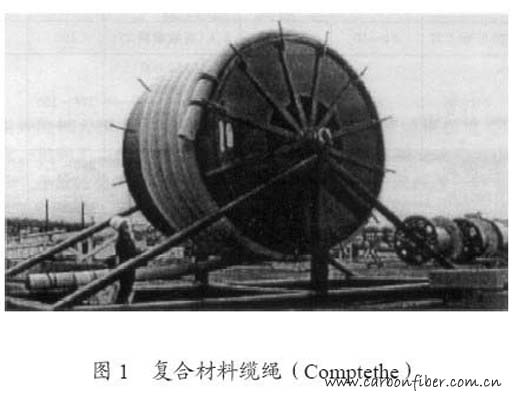 例如,一個深海1 500 m的作業(yè)平臺,用鋼制纜繩(tether)約為6 500 t,用CFRP纜繩(Compteter)僅為1 000 t。同時,前者最大深度只能到1 500 m左右,而后者可用到3 000 m的深海油田。此外,復(fù)合材料纜繩可卷繞到直徑為4.4 m的芯軸上,運輸和作業(yè)非常方便。圖1是復(fù)合材料纜繩,圖2是準備在海面安裝的復(fù)合材料管材。