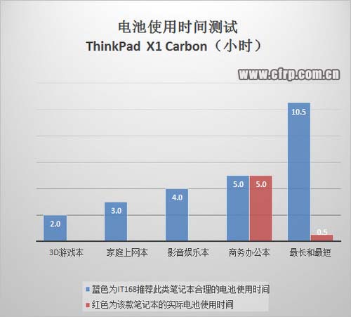 對(duì)于超極本來(lái)說(shuō),英特爾要求所有的超超極本在MobileMark2007電池使用時(shí)間測(cè)試中必須超過(guò)5小時(shí),而ThinkPad X1 Carbon在屏幕亮度調(diào)整到50%以后,在該項(xiàng)測(cè)試中運(yùn)行了301分鐘(5小時(shí)1分鐘),達(dá)到英特爾的要求,基本滿足日常應(yīng)用的需求。