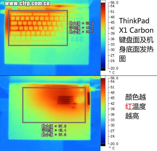 對(duì)于整機(jī)的發(fā)熱量來(lái)說(shuō),由于ThinkPad X1 Carbon機(jī)身過(guò)于纖薄,這導(dǎo)致其機(jī)身表面部分區(qū)域存在熱量堆積,在室溫25℃,經(jīng)過(guò)30分鐘拷機(jī)測(cè)試以后,其鍵盤(pán)面左側(cè)溫度52.9℃,機(jī)身底部散熱孔附近最高溫度達(dá)到57.3℃,大家使用時(shí)應(yīng)避免將其放在柔軟的物體表面堵塞出風(fēng)孔影響散熱。