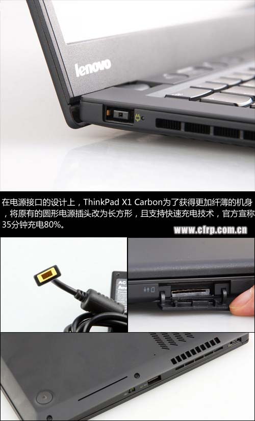 在電源接口的設(shè)計(jì)上,ThinkPad X1 Carbon為了獲得更加纖薄的機(jī)身,將原有的圓形電源插頭改為長(zhǎng)方形,且支持快速充電技術(shù),官方宣稱35分鐘充電80%。