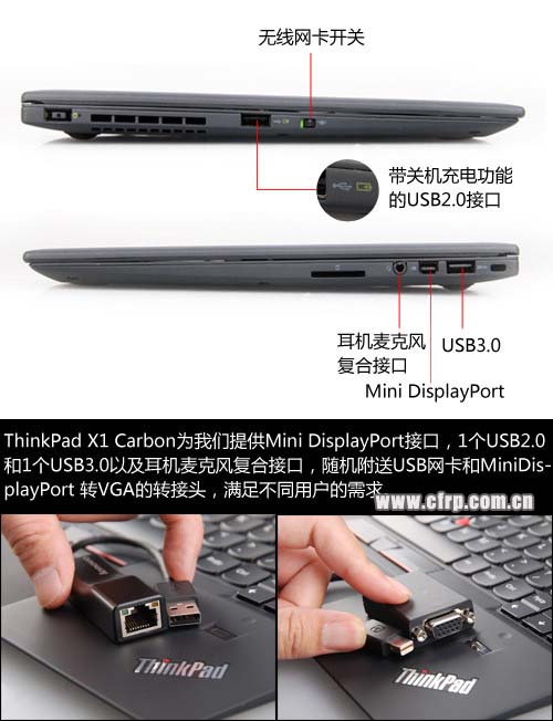 在整機(jī)擴(kuò)展性上,ThinkPad X1 Carbon為我們提供了Mini DisplayPort 接口,1個(gè)USB2.0和1個(gè)USB3.0以及耳機(jī)麥克風(fēng)復(fù)合接口,隨機(jī)附送USB網(wǎng)卡和Mini DisplayPort 轉(zhuǎn)VGA的轉(zhuǎn)接頭,滿足不同用戶的需求。不過(guò)在眾多接口中特別值得一提的是Mini DisplayPort 接口,它可實(shí)現(xiàn) 2560×1600 分辨率的外接顯示屏的擴(kuò)展,而帶有電池標(biāo)示的USB接口支持關(guān)機(jī)充電功能。