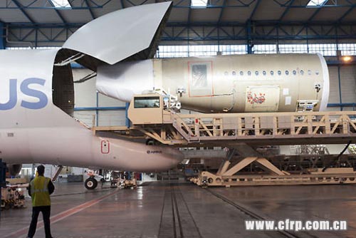2012年4月25日,用于對A350XWB寬體飛機進行靜態(tài)結(jié)構(gòu)測試的飛機后端機身抵達總裝線,空客A350XWB后機身段長20米,采用的是碳纖維復合材料,由機身尾段和四塊后機身蒙皮組成。(如圖)