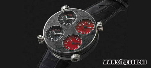 碳纖維手表除了材質(zhì)本身的魅力,在設(shè)計(jì)上也力求創(chuàng)意和精巧,將碳纖維優(yōu)勢由內(nèi)而外地發(fā)揮出來。在《Style Carve》雜志推薦的十款性感的男士碳纖維腕表中,位列第一、最受青睞的就是 布雷博(Brembo)的Quattro Valvole CCM。碳纖維的黑色經(jīng)典表面上,張揚(yáng)的兩黑兩紅共四個(gè)小表盤非常醒目。設(shè)計(jì)的靈感來自于四氣門發(fā)動(dòng)機(jī)的汽缸頭,在四個(gè)氣門的位置各自安裝了獨(dú)立的手表機(jī)芯。該款手表并不是布雷博自己推出的,而是聯(lián)合意大利著名手表廠商麥卡尼克·費(fèi)洛奇(Meccaniche Veloci)共同推出的,亮相于2009 巴塞爾鐘表展上,售價(jià)為15000美元左右。這款表的顏色也做了大膽的嘗試,除黑色外,還有黃色、紅色和銀色。