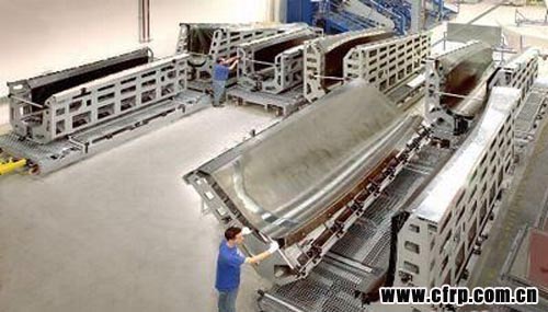 用預浸料——熱壓罐工藝生產碳纖維制造復合材料,要先將碳纖維浸溶在樹脂溶劑里,進行鋪疊成型。接著經過模具工裝進行表面組裝固定,在部件接觸面貼膠。其后進熱壓罐100——130度固化,并通過緊固成為成品構件。