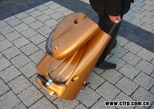 同時(shí),設(shè)計(jì)人員還考慮到了衛(wèi)生問(wèn)題,讓摩托車(chē)折疊后完全變成一個(gè)類(lèi)似手提箱的物體,這樣使用者在拖行過(guò)程中就不會(huì)接觸到摩托車(chē)車(chē)身較臟的部位。