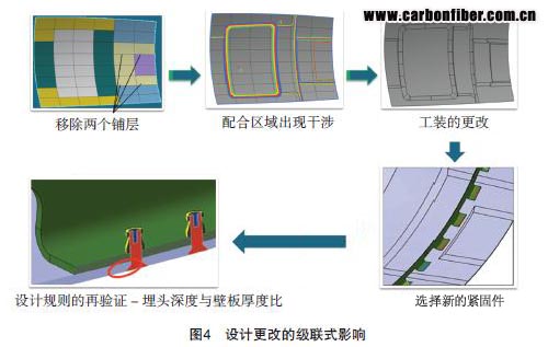 對(duì)于設(shè)計(jì)流程,設(shè)計(jì)更改是無(wú)處不在的,并且是一定會(huì)做設(shè)計(jì)更改的。那么設(shè)計(jì)更改的影響是什么呢?考慮機(jī)身壁板中蒙皮厚度變化和基礎(chǔ)結(jié)構(gòu)位置移動(dòng)的連鎖影響。圖4說(shuō)明的是由于簡(jiǎn)單的鋪層的變化帶來(lái)的一系列的設(shè)計(jì)更改。