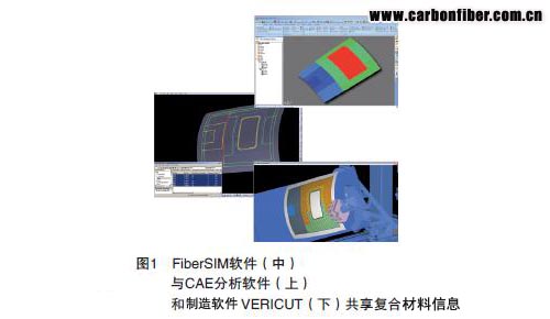 如圖1 所示,在CATIA V5 設(shè)計(jì)進(jìn)程中,VISTAGY 的FiberSIM® 軟件、應(yīng)力分析的MSC 軟件SimXpert 有限元模型、用于為自動(dòng)鋪絲機(jī)生成制造數(shù)據(jù)的CGTech VERICUT 復(fù)合材料編程及仿真軟件無(wú)縫共享復(fù)合材料機(jī)身壁板的鋪層信息。