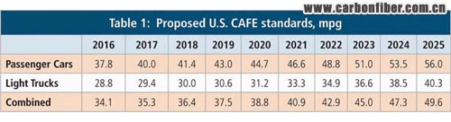 在美國,國家公路交通安全管理部門(簡稱“NHTSA”)和環(huán)境保護機構(gòu)(簡稱“EPA”)正在對“公司平均燃油經(jīng)濟(簡稱 ‘CAFE’)標準”進行修訂,修訂后的標準將在2017~2025年間執(zhí)行。CAFE標準是美國政府針對所有被售賣到美國的轎車和卡車而設立的汽車燃油效率標準。這一被提議的“2017~2025標準”,要求汽車的燃油效率要有大幅度的提升。