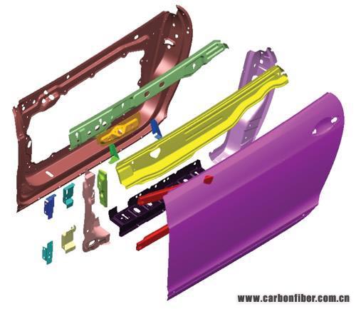 圖3 作為汽車復合材料領域的資深專家,Antony Dodworth表示,將碳纖維復合材料整合到轎車或卡車中的最大障礙主要發(fā)生在設計和工程開發(fā)階段。例如,一個復合材料的車門(上圖),能夠使用比金屬車門(下圖)少得多的部件被設計和制造出來