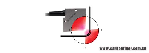 Olympus also offers a solution for the inspection of CFRP radii. This solution features appropriate holders and curved linear arrays that cover the entire corner in a single pass. The geometry of the probe allows for all of the ultrasonic beams to coincide at 90° with the surface of the corner in a manner similar to flat-surface inspection. This radii inspection is performed in water immersion, either from the inside or the outside of the radii, depending on the shape and size.