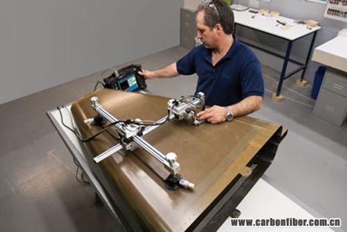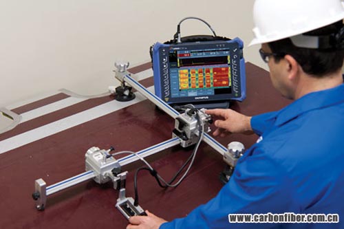 在維護(hù)檢測(cè)過程中,可以很快探測(cè)到某些典型的缺陷,如:脫膠缺陷、嵌入材料補(bǔ)修區(qū)域中的夾雜物等。此外,在制造業(yè)環(huán)境中,可以方便地使用CFRP解決方案,檢測(cè)出關(guān)鍵性的分層和多孔性缺陷。這個(gè)解決方案可在生產(chǎn)過程中對(duì)較大的材料表面,或維護(hù)過程中修理后的工件,進(jìn)行完整的半自動(dòng)成像操作。還可以用于對(duì)較小工件或難于接觸到的區(qū)域,進(jìn)行手動(dòng)檢測(cè)。