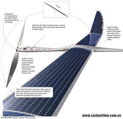 Solara 50采用碳纖維復合材料主體結構,并大量運用了玻纖和芳綸纖維等材料以實現機身減重。Google和Titan認為,該機型通過搭載電子通訊設備,可稱為移動的互聯網接入平臺,并在探測、救災領域發(fā)揮重要作用。該機型預計在2014年年內實現首飛。