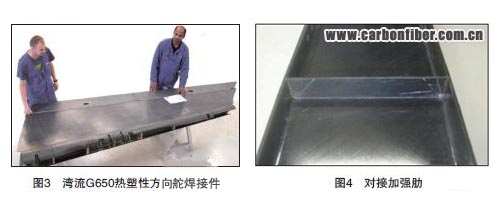 熱塑性復(fù)合材料主結(jié)構(gòu)件是一個(gè)過(guò)去即有涉獵的領(lǐng)域。灣流G550和G650 飛機(jī)的壓力艙壁板(圖2)是一系列帶壓力成型加強(qiáng)肋的碳/聚醚酰亞胺??湛虯400M 的駕駛艙地板就是用熱塑性復(fù)合材料制造的。最近,已經(jīng)著手焊接主操縱面。新型灣流G650 公務(wù)機(jī)(JEC2010 創(chuàng)新獎(jiǎng)得主)的方向舵和升降舵就是感應(yīng)焊接的多肋扭力盒結(jié)構(gòu)(圖3)。