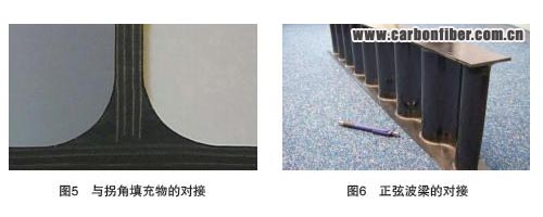 2003 年,一種碳/ 聚醚醚酮單向帶(Cytec)制成的客機(jī)地板梁得到發(fā)展。這種可高效制造產(chǎn)品很適合航空業(yè),因此,緯線鋪放(pick & place)被選作腹板和緣條的預(yù)成型體成型方法。所有這些元件都在共固結(jié)的過(guò)程中被熔合在一起。在研發(fā)工字梁組合件的過(guò)程中,曾經(jīng)尋求一種可簡(jiǎn)化制造大量加強(qiáng)肋的方法。該方法是“對(duì)接”1 塊平層壓板,將其與普通工字梁共固結(jié)在一起(圖4)。這被證明是一個(gè)有效的解決方案。在制造上比最初設(shè)計(jì)的壓力成型加強(qiáng)肋的方法簡(jiǎn)單得多。對(duì)接強(qiáng)度采用注射成型,增加了坡口圓角半徑,得到了優(yōu)化(圖5)。