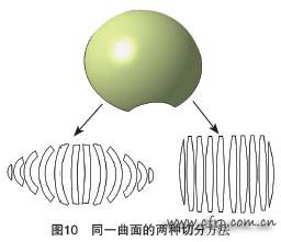 復(fù)合材料結(jié)構(gòu)中承載纖維的關(guān)鍵是要連續(xù)和繃緊。有一種曲面鋪疊方法是將等高線做為基準(zhǔn),其具體做法是用一組平行的平面去切割曲面,將交線做為鋪層的基準(zhǔn)方向并且作為小鋪層的拼接線。這種方法對(duì)于平面是正確的,但是對(duì)于曲面時(shí)就會(huì)出現(xiàn)問(wèn)題,在鋪疊并排的小鋪層時(shí)會(huì)出現(xiàn)不規(guī)則形狀,在預(yù)浸料的邊緣出現(xiàn)大量的斷纖維,有的地方甚至所有的纖維都是斷的,這種現(xiàn)象會(huì)隨曲率的變化而加劇。顯然,斷了的纖維不能傳遞載荷,只有在垂直于切割平面的附近的纖維是連續(xù)的,這種方法不合理(圖9、圖10)。 本文來(lái)自123