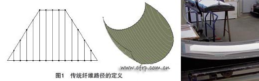 復(fù)合材料結(jié)構(gòu)中的主要承載材料為纖維,纖維方向的可設(shè)計(jì)性是其特點(diǎn)之一。迄今為止,對(duì)預(yù)浸料鋪疊成型復(fù)合材料結(jié)構(gòu)中的纖維方向的定義都很籠統(tǒng),一般只是規(guī)定了結(jié)構(gòu)中某一點(diǎn)的纖維方向,其余纖維并行鋪放(圖1)。本課題基于對(duì)復(fù)合材料結(jié)構(gòu)中某一組合單元在指定方向上應(yīng)具有最大承載能力的要求,提出了纖維路徑的概念,并由每層纖維并行排列、連續(xù)纖維均布性、纖維面密度值固定的規(guī)定,引申出每層纖維的連續(xù)性和連續(xù)纖維均布性指標(biāo),提出了最大鋪疊寬度和最小鋪疊寬度的工藝參數(shù),并針對(duì)一些典型曲面的纖維路徑提出了鋪疊工藝的實(shí)施方法。