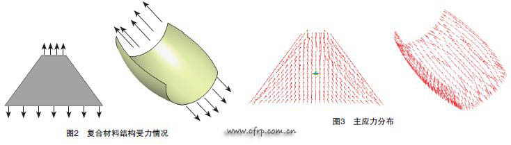 在復(fù)合材料結(jié)構(gòu)中,纖維是主要承載材料,纖維只有在張緊狀態(tài)下才能承受最大載荷。纖維張緊時(shí),其路徑是曲面上最短的,而曲面上最短的距離一定是測(cè)地線。因此,對(duì)于圖2中結(jié)構(gòu)的某一層而言,以0°為例,結(jié)構(gòu)的2 邊受到載荷時(shí),這一層的每根纖維只有按照測(cè)地線分布和排列時(shí),才能使得纖維繃緊并承受最大載荷,即與此點(diǎn)主應(yīng)力一致(圖3)。