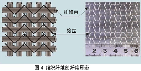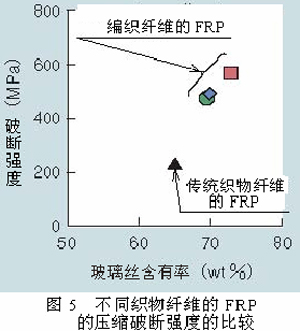 從經(jīng)濟(jì)性考慮強(qiáng)化纖維用玻璃纖維。圖4表示了作為纖維織物主體形態(tài)的編織纖維。由捻絲綁扎、排列整齊的纖維束的起伏很小,使得編織纖維的壓縮強(qiáng)度大為提高。如圖5所示,使用編織纖維的FRP的壓縮破斷強(qiáng)度要高于使用傳統(tǒng)織物纖維的FRP。另外,由于可制作沿0°、90°、±45°等多方向(設(shè)置)及與網(wǎng)格基材等組合成多層織物,因此能夠針對(duì)不同風(fēng)力發(fā)電機(jī)的需求選擇最適合的(編織纖維)基材。