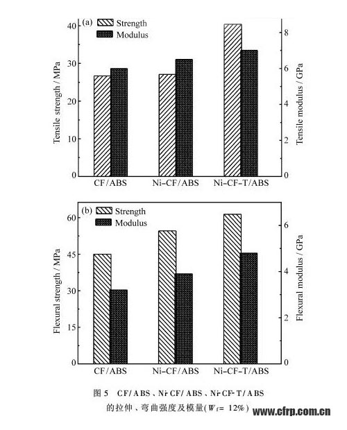 圖5(a)是未鍍鎳碳纖維(CF)以及不使用和使用偶聯(lián)劑處理的鍍鎳碳纖維(Ni-CF)分別與ABS復(fù)合制得的復(fù)合材料(分別簡寫為CF/ABS、Ni-CF/ABS、Ni-CF-T/ABS)的拉伸強(qiáng)度和拉伸模量(碳纖維質(zhì)量分?jǐn)?shù)為12%)。從圖5(a)可以看出,經(jīng)鈦酸酯偶聯(lián)劑處理過的Ni-CF-T/ABS的拉伸強(qiáng)度和拉伸模量均比其他2種復(fù)合材料高,分別為41MPa和7GPa。CF/ABS和Ni-CF/ABS的拉伸強(qiáng)度相差不多,為27MPa左右;拉伸模量分別為6GPa和6.5GPa。Ni-CF/ABS的拉伸性能略高于CF/ABS。