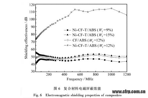 其中:μr為材料相對銅的磁導(dǎo)率;σr為材料相對銅的電導(dǎo)率;f為電磁波的頻率;t為材料厚度。因此,當(dāng)材料厚度t和入射電磁波頻率f一定時,材料的電磁屏蔽效能主要與σr和μr有關(guān)。纖維表面金屬化后,σr和μr值增大,復(fù)合材料屏蔽效能增加。圖6是復(fù)合材料在30~1200MHz頻率范圍內(nèi)的電磁屏蔽效能曲線。由圖6可以看出,Wf=12%時,CF/ABS的屏蔽值在50dB左右,而Ni-CF-T/ABS的屏蔽值均在73dB以上,最高可達(dá)114dB。在500~1000MHz范圍內(nèi),碳纖維鍍鎳對電磁屏蔽性能的增強(qiáng)作用尤為顯著,屏蔽值提高60dB??梢?纖維表面金屬化可明顯提高材料的電磁屏蔽性能。同時,110dB的屏蔽值超過國外同類產(chǎn)品。