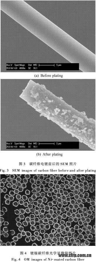 采用SEM對碳纖維電鍍前后的形貌進(jìn)行觀察;采用光學(xué)顯微鏡對材料鍍層厚度進(jìn)行觀察;彎曲性能參照GB/T9341-2000,采用CSS-44001電子萬能試驗機(jī)測試;電磁屏蔽效能參照QJ2809-96,由中國計量科學(xué)研究院測定。測試環(huán)境條件:溫度為22.5℃;濕度為45%(RH);測試頻率范圍為30~1200MHz。