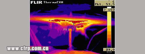 但是這是在沖擊發(fā)生后用10-15秒的紅外照相機(jī)拍攝到的照片;溫度等級(jí)圖表明洞四周的部分溫度已經(jīng)超過(guò)153°C,洞中間的碳纖維仍然在燃燒。