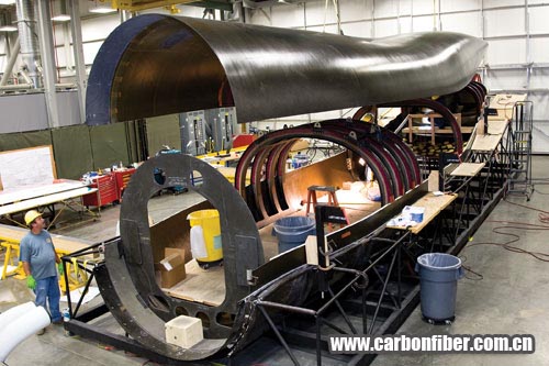 圖3 先進(jìn)復(fù)合材料貨運(yùn)飛機(jī)的機(jī)身由8個(gè)部件組成,它們采用英國(guó)先進(jìn)復(fù)合材料集團(tuán)(ACG)提供的MTM-45預(yù)浸料經(jīng)過(guò)OOA固化制成。圖片來(lái)源:洛克希德馬丁公司 123456