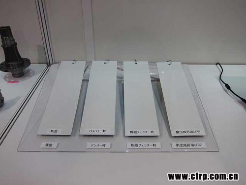 圖:碳纖維強(qiáng)化PP的成形樣品 最右邊寫著“射出成形用CFRP”的是在碳纖維強(qiáng)化PP成形品上涂了白漆的樣品。從左邊起依次是鋼板、保險(xiǎn)杠用PP成形品、在擋泥板用樹脂成形品上涂了白漆的樣品。