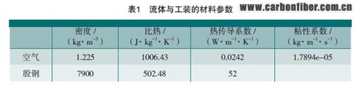 由經(jīng)驗(yàn)和工藝試驗(yàn)可知工裝的變形均在毫米量級(jí),工裝的尺寸在幾米至十幾米,工裝結(jié)構(gòu)變形不會(huì)對(duì)熱壓罐內(nèi)的氣體流動(dòng)產(chǎn)生明顯影響。由于流體計(jì)算對(duì)網(wǎng)格要求較高,文中使用專業(yè)流體仿真軟件FLUENT進(jìn)行工裝及熱壓罐內(nèi)整個(gè)流場(chǎng)的網(wǎng)格劃分,如圖3所示。對(duì)工裝建立的有限元模型既可以適用于溫度場(chǎng)的計(jì)算,也可以用于工裝的結(jié)構(gòu)變形計(jì)算。熱壓罐工藝規(guī)范簡(jiǎn)化如圖4所示,溫度場(chǎng)計(jì)算所用相關(guān)材料參數(shù)如表1所示。