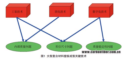 整體成型的大型復(fù)合材料壁板制件,針對其結(jié)構(gòu)特點(diǎn)以及存在的主要問題,其成型的關(guān)鍵技術(shù)主要有3個方面:工裝技術(shù)、固化成型技術(shù)、數(shù)字化技術(shù),如圖1所示。