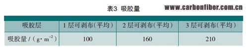 大型復(fù)合材料壁板因?yàn)楹穸茸兓?,所以各個區(qū)域余膠量分布不均,在制件制備過程中則要通過預(yù)吸膠環(huán)節(jié)控制各個區(qū)域厚度在標(biāo)準(zhǔn)范圍之內(nèi),這就要求我們對預(yù)吸膠工藝進(jìn)一步掌握。吸膠材料和吸膠時間是對吸膠量的關(guān)鍵影響因素,如表3和圖3所示。