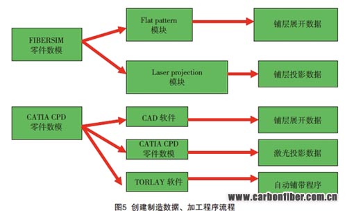通過構(gòu)建復(fù)合材料數(shù)字化制造技術(shù)的軟件平臺,采用專用設(shè)計、工藝軟件建立復(fù)合材料零件三維數(shù)模(工程數(shù)據(jù)),進(jìn)而建立制造數(shù)據(jù)集、程序,實(shí)現(xiàn)與自動下料機(jī)、投影定位、自動鋪帶機(jī)等數(shù)字化設(shè)備的接口,為復(fù)合材料數(shù)字化制造技術(shù)應(yīng)用打下基礎(chǔ),如圖5所示。