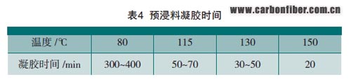 加壓點(diǎn)包括加壓溫度、加壓時機(jī)。加壓點(diǎn)的選擇, 首先是加壓溫度,加壓溫度過低則樹脂流動性不好,纖維不易均勻浸潤易造成缺陷;加壓溫度過高,樹脂聚合速率過快不易掌握加壓時機(jī)。其次在確定加壓溫度的前提下把握好加壓時機(jī),加壓時機(jī)過早則樹脂粘度低,排出樹脂過多造成零件貧膠、孔隙率高;加壓時機(jī)過晚則樹脂聚合程度高,流動性差制件易夾雜氣泡產(chǎn)生疏松、分層等缺陷。加壓點(diǎn)的最佳選擇為樹脂由粘流態(tài)向高彈態(tài)轉(zhuǎn)變過程中的過渡區(qū)間。這和升溫速率、加壓溫度、加壓時機(jī)都密切相關(guān),不同的溫度—時間曲線有著不同的加壓點(diǎn)。目前經(jīng)常采用差熱分析儀和流變儀來了解樹脂的固化反應(yīng)過程和粘度變化過程,實(shí)際生產(chǎn)中也有用滑板法或拉絲法測定凝膠時間來了解樹脂在溫度—時間曲線各個點(diǎn)的粘度情況,如表4、表5所示。