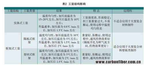 不同結(jié)構(gòu)形式的工裝,結(jié)合復(fù)合材料零件的實(shí)際制造情況,對復(fù)合材料的成型工藝過程會產(chǎn)生不同的影響,尤其是對復(fù)合材料零件固化過程中的加熱效率以及溫度均勻性的影響。具體情況如表2所示。