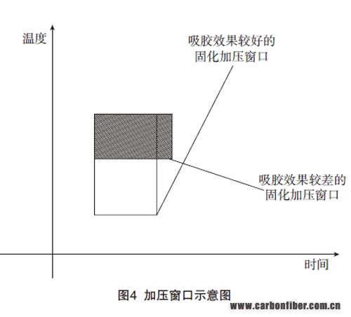 經(jīng)過試驗(yàn)和工藝驗(yàn)證,應(yīng)該轉(zhuǎn)變我們的工藝觀點(diǎn),應(yīng)注重預(yù)成型工藝和吸膠效果。如果吸膠效果不好其坯料中的揮發(fā)份、氣體就不能有效排除,那么在固化過程中隱患比較大,固化工藝的選擇尤為嚴(yán)格,某種意義上講其加壓窗口范圍更小。而反之若預(yù)成型工藝效果理想,坯料中的揮發(fā)份、氣體有效排除,結(jié)構(gòu)密實(shí),那么固化過程中出現(xiàn)問題的機(jī)率較小,固化工藝相對比較好控制,對加壓時機(jī)不那么敏感,尤其是提早加壓對零件固化質(zhì)量影響不大,一定程度上反而是拓寬了加壓窗口,如圖4所示。